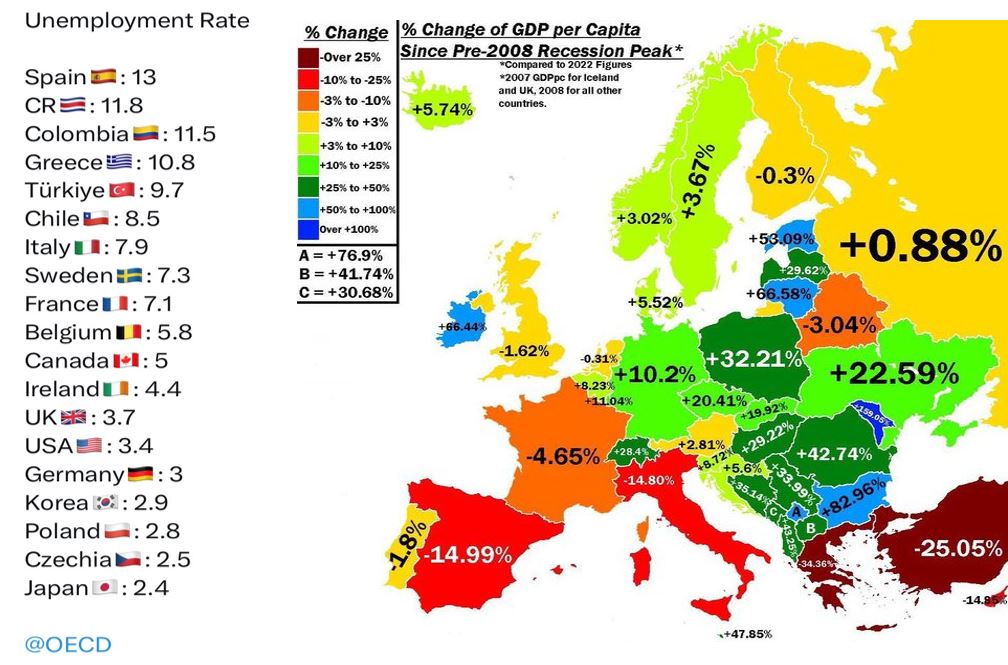 Malgrat els que ens vulguin vendre des de l’estat, les xifres que presenta el regne d’Espanya especialment en dos paràmetres, el de l’atur i el de l’empobriment per càpita, són clarament negatius, segons expressa l’Organització de Cooperació i Desenvolupament Econòmic (OCEE).